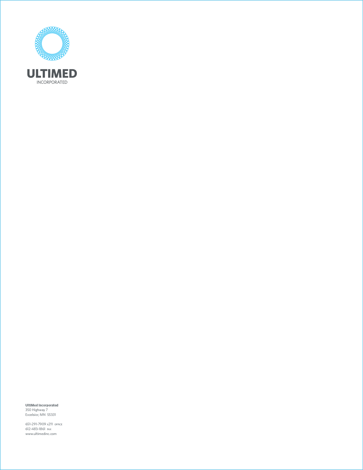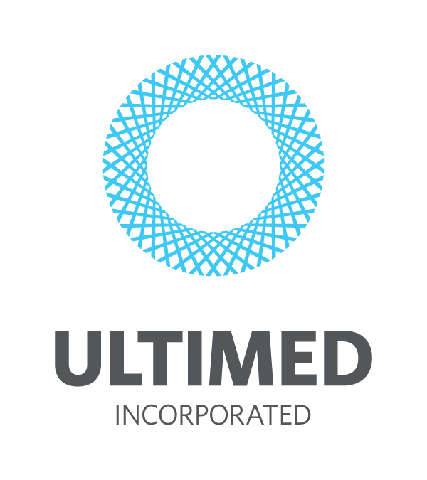 Replaced the outdated logo with a sophisticated interlocking circle mark—a deliberate design choice reflecting precision, connectivity, and the cyclical nature of UltiMed's core product innovation (dispense and dispose). Clean, modern, all-caps ULTIMED typography in grey, paired with the light blue mark, positioned the company alongside premium healthcare brands.