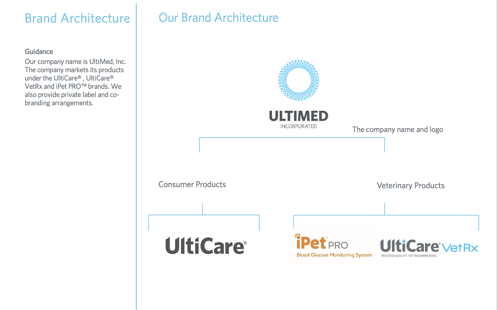 UltiMed operated four distinct product brands—UltiCare (consumer), UltiCare VetRx (veterinary), iPet PRO (veterinary), and UltiGuard SafePack (consumer & veterinary/proprietary system)—with no unified brand architecture governing their relationships to one another or to the parent company.