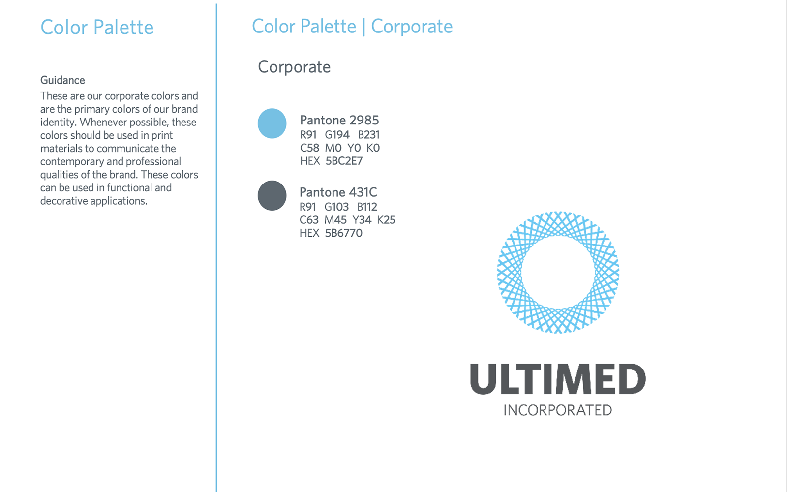Defined UltiMed's brand architecture with the corporate identity as the anchor and four distinct product brands operating beneath it—each with its own visual identity, color palette, typography system, and logo usage rules.