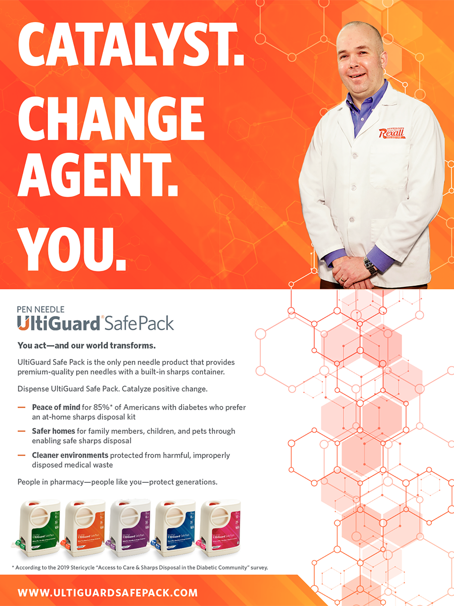 Catalyst. Change Agent. You. (2021)—Pharmacist mission message. Elevated the pharmacist's role as a community health leader. Positioned dispensing UltiGuard SafePack as a professional act of purpose—protecting patients, families, children, and pets from needlestick injuries and medical waste. Featured diverse real pharmacists as the campaign talent, representing the breadth of the profession.