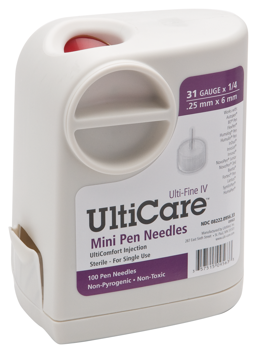 Designed a color-coding system across all five needle sizes—green (4mm), orange (5mm), purple (6mm), blue (8mm), and pink (12.7mm)—applied consistently across the package label and the individual needles dispensed from the bottom of the container. Pharmacists can now instantly identify the right product at the counter. Size and gauge information was redesigned with large, clear typography as the dominant visual element.